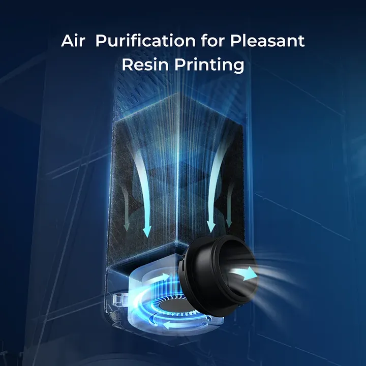Alimentado y controlado directamente a través de la impresora, incluye un filtro de carbón activado reemplazable que es 5,8 veces más grande que otros. Absorbe el olor irritante de la resina de manera más eficiente. En la parte posterior hay un orificio de ventilación para conectar un tubo de ventilación.