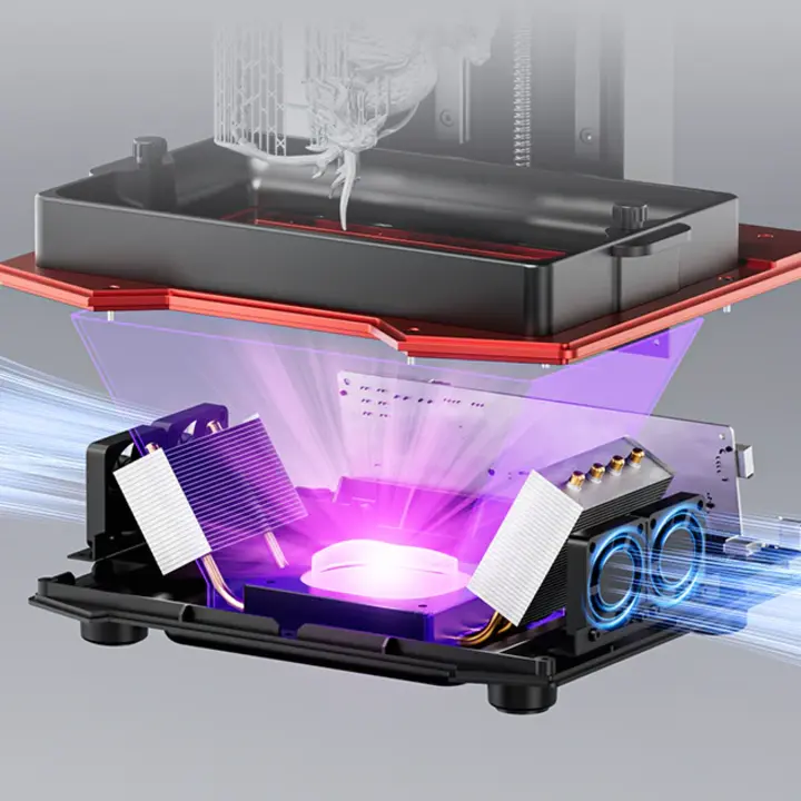 El sistema de disipación de calor mejorado incluye 6 tubos de cobre de doble conducción de calor y 4 ventiladores de refrigeración a ambos lados de la fuente de luz para una ventilación más rápida y una mejor disipación del calor. Esto garantiza que su impresora funcione de manera óptima, prolongando su vida útil.