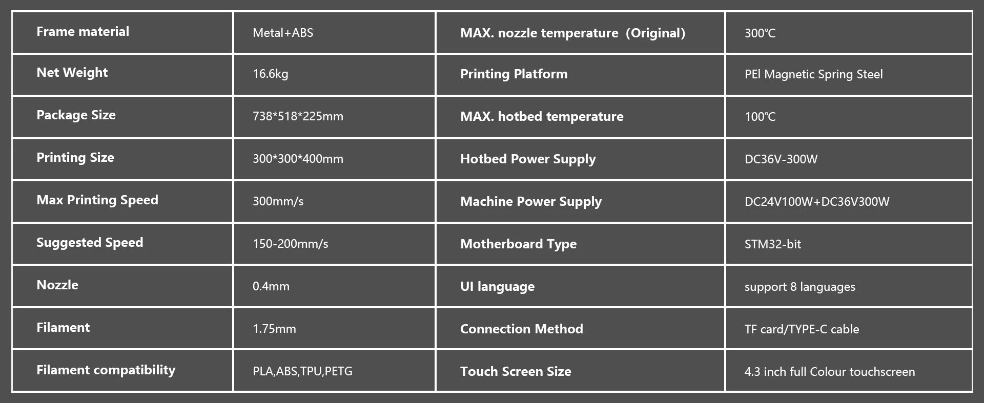 - Tamaño de impresión más grande: 300 × 300 × 400 mm